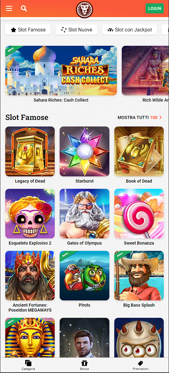 Ci è piaciuta molto la divisione della sezione slot in: Novità, Classifiche, In primo Piano, Le più giocate, Jackpot, Avventura, Scelte per te.